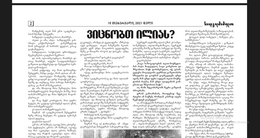 და ვსაუბრობთ ჩვენც, ჩვენი გაზეთის ყველა ნომერში და ვსაუბრობთ ახლაც ილიას გზაზეც, მის გათანამედროვეობაზეც, ვსაუბრობთ ჩვენი საადგილმამულო ფონდის პროგრამაზეც, ილიასეულ წერილებში გამახვილებულ საკითხებზე რომ არის აგებული; ვსაუბრობთ პროექტებზეც, ილიასეული სამეულის დასაცავად საჭირო მექანიზმების – სრულუფლებიანი რეფერენდუმის და დეპუტატის გამოწვევის კანონის დაკანონების აუცილებლობაზე; ვსაუბრობთ ახალ ეროვნულ კონცეფციაზე და ახალ პოლიტიკურ აზროვნებაზეც, ისევ და ისევ ილისეული სამეულიდან – „მამული, ენა, სარწმუნეობა“ რომ გამომდინარეობს და თითქოსდა შეგვიძლია, ვთქვათ, რომ ვიცით ილია, ვიცნობთ ილიას, მაგრამ…